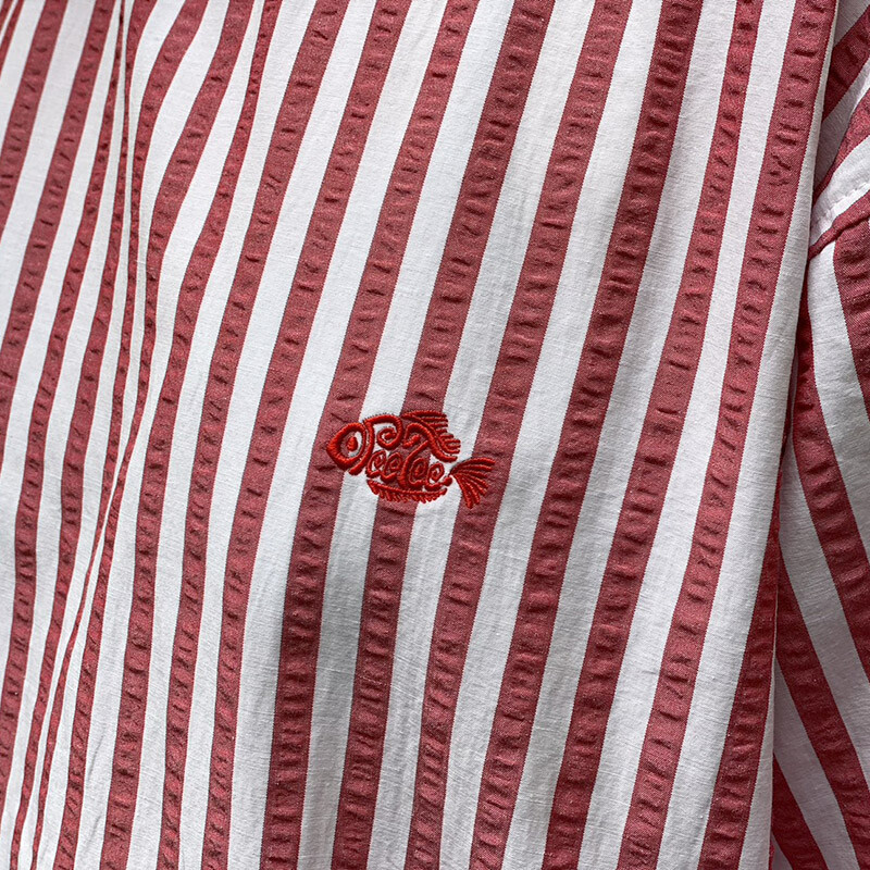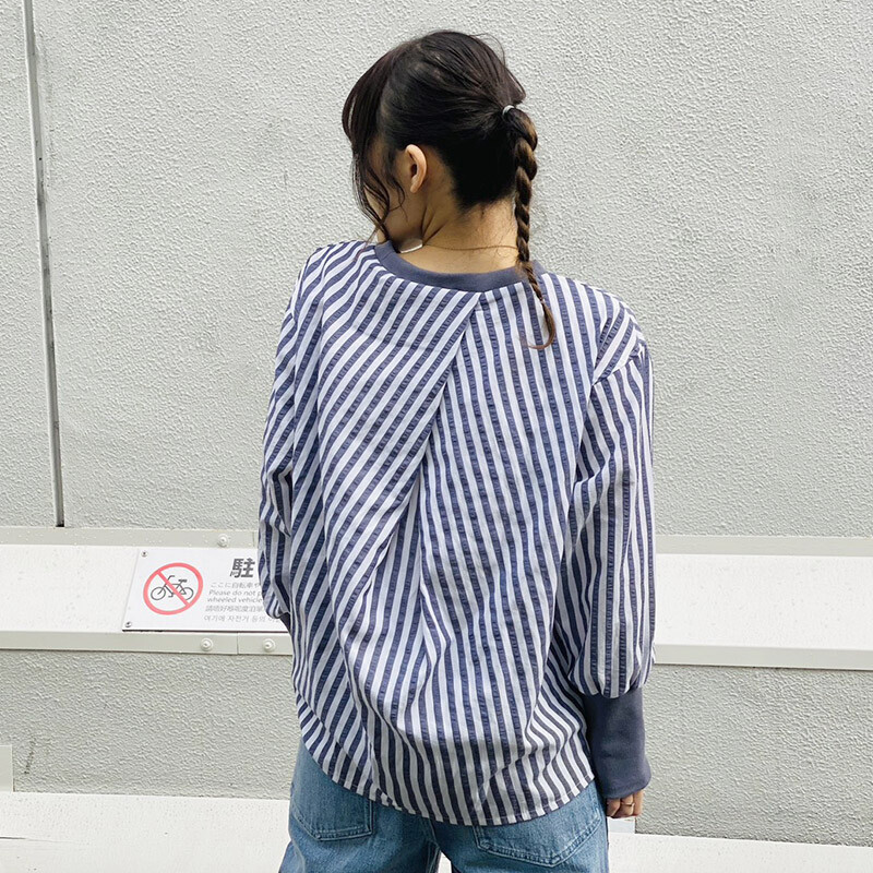 胸元にフィッシュロゴをワンポイント刺繍しました。シワ感のあるコットンポリエステル素材で軽やかな着心地の一枚。太めピッチのストライブに袖口の長めのリブが特徴的。軽くてすぐ乾く生地は、天候&気温の安定しない季節に大活躍間違いなし。リブ使いでカジュアル感をプラスし、後ろに深いタックを入れることでふわっと広がるスカートでもパンツでもきれいなシルエットが魅力です。シンプルながら細かなこだわりが詰まった1枚でサマになるアイテムです。