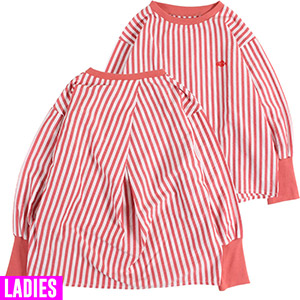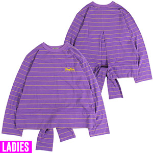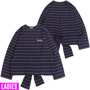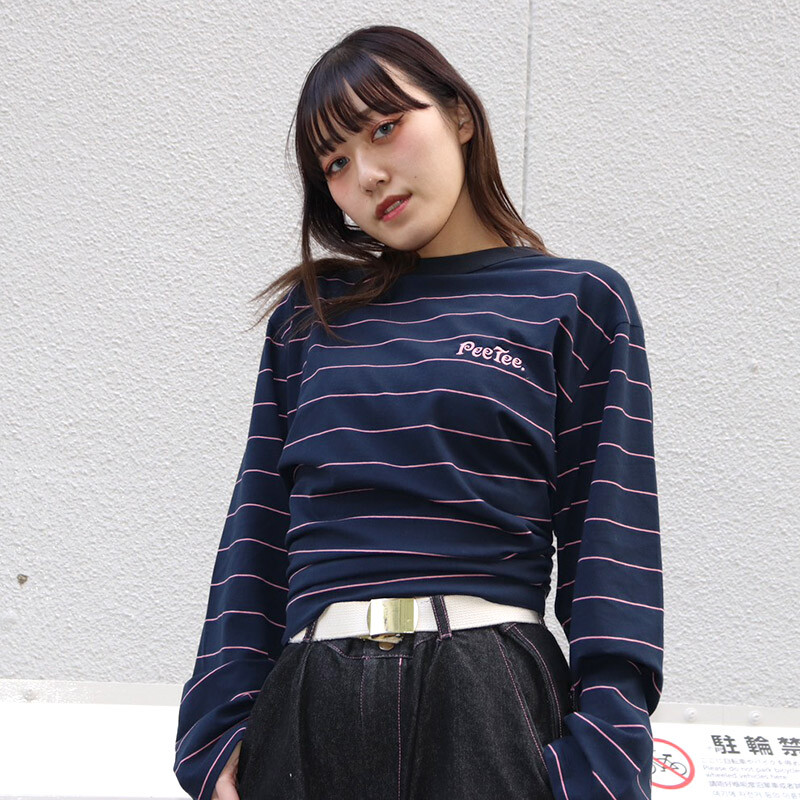 細めのピンストライプボーダーが特徴的なロンTee。胸元にボーダーカラーと同系色でグルーピーロゴを刺繍しました。後ろに大胆なスリットを入れ、裾の共地リボンをしばって着用するデザイン。好みの位置でしばれるのでボトムに合わせて丈感を調節できます。ストレッチの効いた生地でリラックスして着用でき、ルーズな印象の長め袖もポイントです。