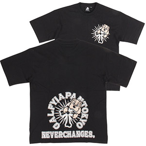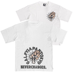 お馴染みのワンちゃんが、クロス型の骨をワイルドに咥えた「おしゃぶりワンワン」デザイン。フロントの胸元にはワンポイントで、バックには腰位置に大胆なサークルロゴと共に配置されています。GALFYらしい「コワ可愛い」絶妙なニュアンスが魅力です。プリントではなく、立体感のあるアップリケ刺繍を採用。キャラクター部分やロゴの縁取りなど、細部まで丁寧に作り込まれており、タフな使用にも耐える重厚感とクオリティを演出します。程よいドロップショルダーと、ゆとりを持たせた身幅が特徴でストリートスタイルには欠かせないルーズなサイジングが、一枚で着てもサマになり、レイヤードスタイルにも最適です。女性にもおすすめのユニセックスアイテムになります。