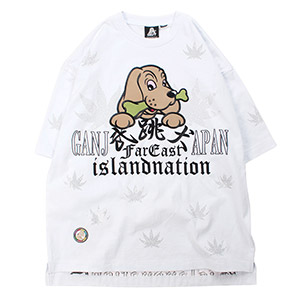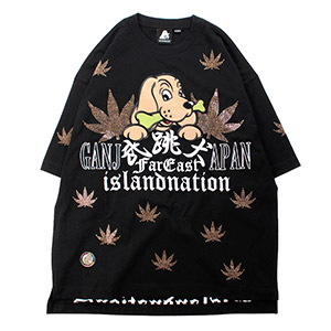 アイコニックなおなじみのワンちゃんを、みどりな骨を咥えた武跳(ぶっとび)な赤目仕様でオン。贅沢に散りばめられたゴールドのガンジャスタッズが光を反射して、ラグジュアリーかつアウトローな雰囲気を演出します。バック裾部分には、燃えるような日章旗グラフィックがフロントのクールな印象に対し、鮮やかなカラーリングでバックスタイルを彩ります。スタッズの輝きと日章旗がクロスオーバーする唯一無二のGALFY流アイランドネイション。程よいドロップショルダーと、ゆとりを持たせた身幅が特徴でストリートスタイルには欠かせないルーズなシルエットが、女性にもおすすめのユニセックスアイテムになります。